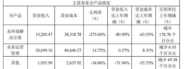 从财报来看,*ST博天毛利率为负数,经营状况不乐观。公司营收主要来自水环境解决方案和水务运营管理两大产品,然而,去年水环境解决方案的毛利率降至-275.66%,连续为负且下降明显。
