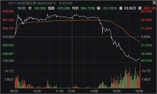 港股市场近期大牛股药捷安康出现大反转,早盘时还一度大涨逾63%,最高触及679.5港元/股,短短7个交易日上涨超10倍;以上市首日开盘价20港元计算,不到3个月时间飙涨超30倍,总市值一度达到逾2697亿港元。午后,药捷安康画风突变,快速跳水。截至收盘,跌逾53%,报192港元/股。