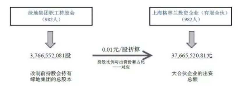 2014年1月,绿地集团开始搭建新的员工持股平台,先由绿地集团管理层43人,共计出资10万元,设立了一家管理公司——上海格林兰投资管理有限公司(简称“格林兰投资”),绿地集团核心掌舵人、法定代表人张玉良持股30%;2月,成立32个小合伙企业,格林兰投资担任普通合伙人(GP),将职工持股会全部982名职工作为有限合伙人(LP)装入其中,所有合伙人出资额与其在职工持股会持有的股份同比例对应;随后,成立大合伙企业——上海格林兰(出资37,665,520.81元,与原职工持股会出资额完全一致),格林兰投资担任GP,32个小合伙企业担任LP;最后,大合伙企业吸收合并职工持股会,继承其全部资产、债权债务及其他一切权利和义务,成为绿地集团股东。大、小合伙企业及其全体合伙人将全部权利委托给格林兰投资,至此,成功解决职工持股会这一上市阻碍。