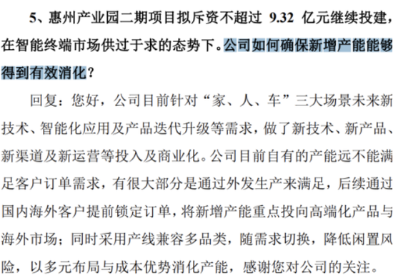 证券之星注意到,在智能终端市场供过于求的背景下,创维数字惠州产业园二期项目(以下简称“二期项目”)仍计划投入不超过9.32亿元继续建设。如何确保新增产能得到有效消化,成为投资者关注的重点。