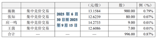 相关减持公告显示,2025年6月30日至2025年9月15日期间,公司董事长施驰、副总经理兼董事会秘书张知、董事应一鸣、财务总监王茵均以集中竞价的方式,合计减持公司996万股,减持比例为0.87%,共套现1.31亿元。本次减持完成后,施驰、张知、应一鸣及王茵持股比例分别为2.43%、0.21%、0.02%、0.02%。