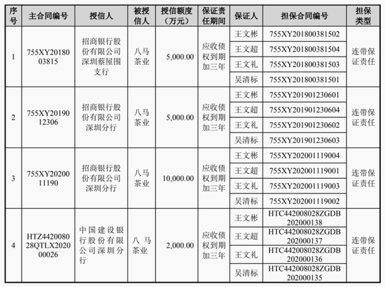 不过,八马茶业其它关联交易频繁。《招股书》显示,2020年八马茶业发生关联交易的金额约为3亿元,其中2.2亿元是王文彬等人为八马茶业提供担保。