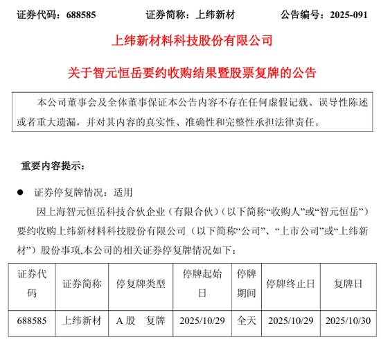 上纬新材表示,本次要约收购期限已届满,且要约收购结果已确认,经向上海证券交易所申请,公司股票自2025年10月30日(星期四)开市起复牌。
