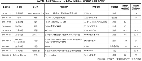 2025年全球医药License-out交易总金额Top10项目中8项来自中国。