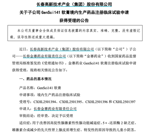 2025年12月27日,长春高新发布一则公告:由子公司金赛药业研发的一款编号为GenSci141的软膏注册性临床试验申请,已获得国家药品监督管理局受理。