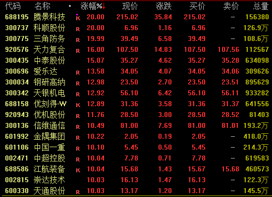 全市场近3600股飘红,小盘股整体活跃。商业航天概念卷土重来,腾景科技尾盘涨停创历史新高,三角防务、广合科技等均涨停;可控核聚变概念拉升,雪人集团、浙富控股等涨停,哈焊华通涨超7%;石油、燃气、煤炭等资源股集体上扬,洲际油气、蓝焰控股、百通能源等涨停。CPO概念再度活跃,光模块“三剑客”集体放量飙升,中际旭创(300308)涨近7%,全日成交242.7亿元,位居A股成交额首位;新易盛、天孚通信分别上涨3.77%、5.96%,全日分别成交176.1亿元、100.2亿元。值得注意的是,近日连续5跌停的国晟科技(维权)午后直线拉升,上演“地天板”走势。