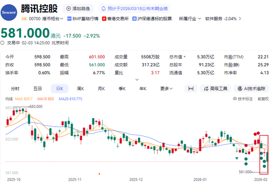 2月3日,腾讯股价开盘大跌,盘中跌幅一度超过6%。对于市值超5万亿港元的腾讯而言,盘中市值一度蒸发3375.51亿港元。而这已经是连续三个交易日下跌了,股价累计跌幅一度超8%。
