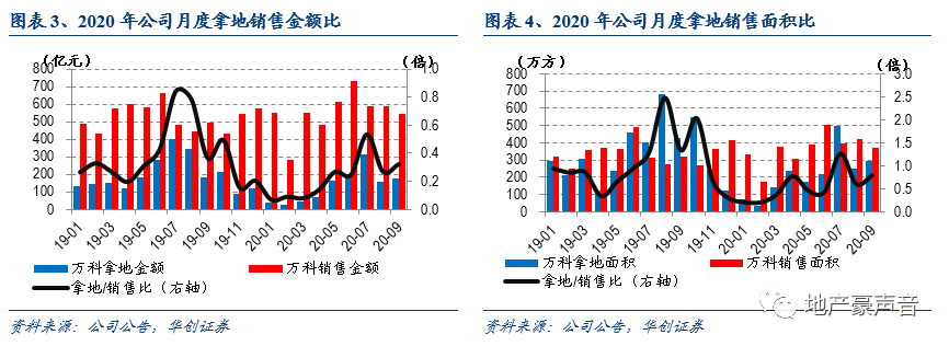 9月公司实现签约金额545.4亿元,环比下降7.1%、同比增长10.7%;实现签约面积371万平,环比下降12.3%、同比增长15.7%;销售均价14,701元/平,环比增长5.9%、同比下降4.4%。1-9月公司累计实现签约金额4,927.6亿元,同比增长3.6%,较1-8月提高0.8pct;累计实现签约面积3,264.8万平,同比增长6.6%,较1-8月提升1.1pct;累计销售均价15,093元/平,同比下降2.8%,较1-8月下降0.2pct。考虑到房企全年销售计划完成约束,我们认为20Q4销售仍将保持稳增;并且在一二线市场销售平稳的背景下,我们预计公司2020年销售或将稳增。