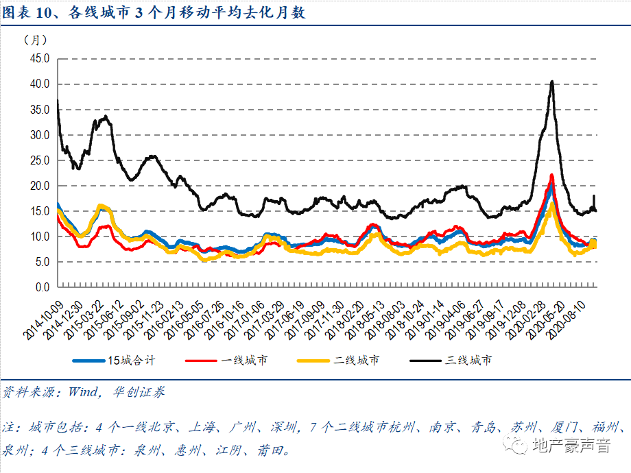 上周末(2020/10/16)15个重点城市住宅3个月移动平均去化月数为8.8个月,环比下降0.5个月。其中,一线城市3个月移动平均去化月数为8.1个月,环比上升0.1个月。北上广深去化月数分别为15.1个月、5个月、7.9个月、6.3个月。二线重点城市3个月移动平均去化月数为8.2个月,环比下降0.9个月。三线重点城市3个月移动平均去化月数为15.1个月,环比下降0.3个月。