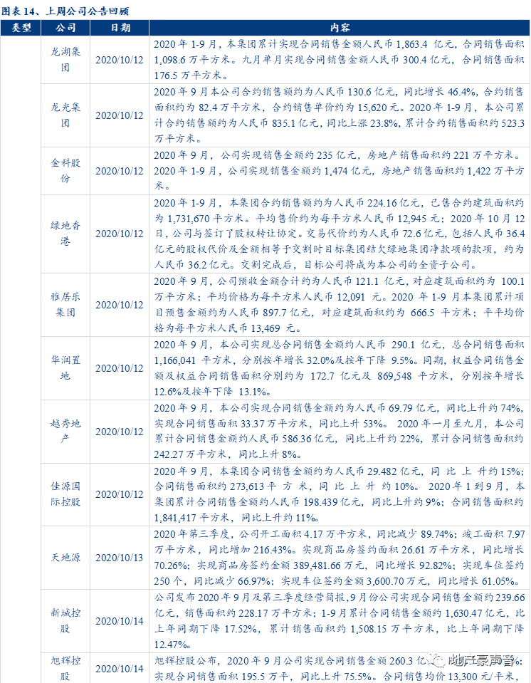 龙光集团9月合约销售额约为人民币130.6亿元,同比增长46.4%,合约销售面积约为82.4万平方米,合约销售单价约为15,620元;公司发行3亿美元2025年到期年息5.25%的优先票据。金科股份9月实现销售金额约235亿元,房地产销售面积约221万平方米;1-9月,实现销售金额约1,474亿元,房地产销售面积约1,422万平方米。新城控股9月份实现合同销售金额约239.66亿元,销售面积约228.17万平方米。旭辉控股9月实现合同销售金额260.3亿元,同比上升30.2%;实现合同销售面积195.5万平,同比上升75.5%。阳光城9月新增计容面积 69.97 万平方米;集团发行住房租赁专项公司债券,发行规模为8亿元。龙湖集团9月实现合同销售金额300.4亿元,销售面积176.5万平方米。