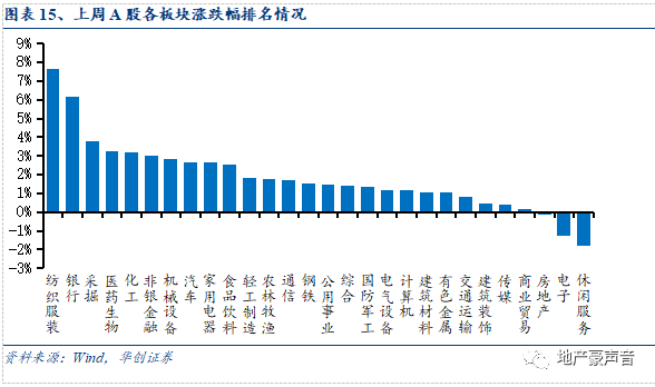 板块表现方面,SW房地产指数下跌0.12%,沪深300指数上涨2.36%,相对收益为-2.48%,板块表现弱于大市,在28个板块排名中排第26位。个股表现方面,SW房地产板块涨跌幅排名前5位的房地产个股分别为:阳光股份、新黄浦、东华实业、银润投资、三湘股份,上周涨跌幅排名后5位的房地产个股分别为深物业A、九龙山、深振业A、荣丰控股、美好集团。