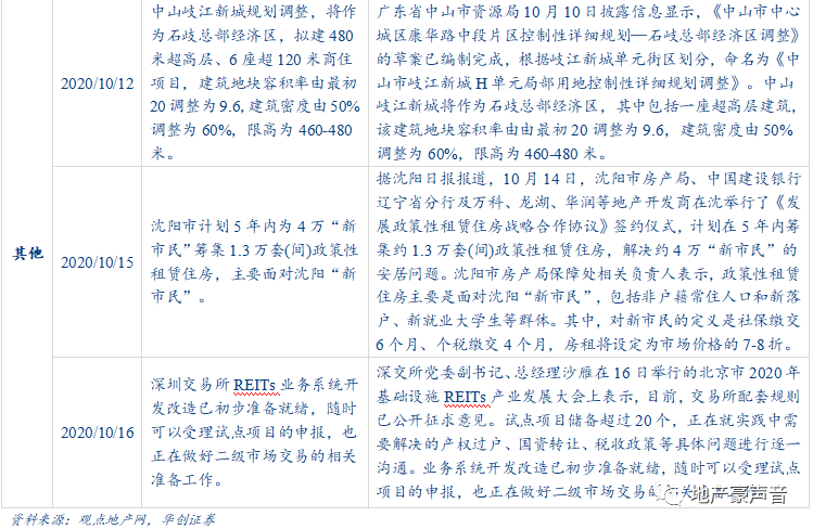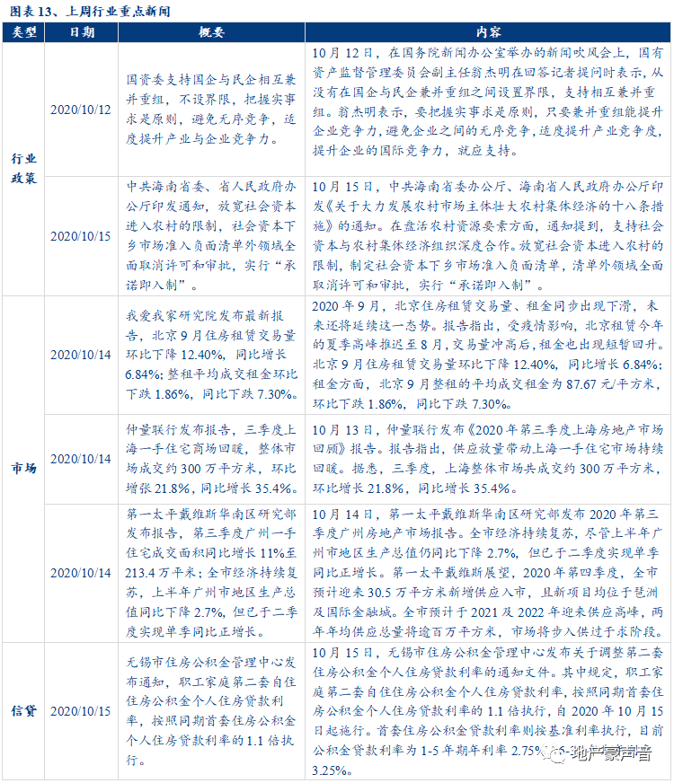 2 主要政策新闻:国资委支持国企与民企相互兼并重组,不设界限。海南放宽社会资本进入农村的限制,实行“承诺即入制”。北京9月住房租赁交易量环比下降12.40%,同比增长6.84%;整租平均成交租金环比下跌1.86%,同比下跌7.30%。三季度上海一手住宅商场回暖,整体市场成交约300万平方米,同比增长35.4%;广州一手住宅成交面积同比增长11%至213万平米。无锡职工家庭第二套自住住房公积金个人住房贷款利率,按照同期首套住房公积金个人住房贷款利率的1.1倍执行。沈阳市计划5年内为4万“新市民”筹集1.3万套(间)政策性租赁住房。深圳交易所REITs业务系统开发改造已初步准备就绪。近期,卓悦商企、世茂服务、金科服务等物业企业将陆续于港股上市。