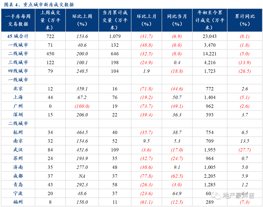 (一)新房成交量:上周45城周成交环比+154%,月成交同比-7%,一二线同比-7%、三四线同比-7%