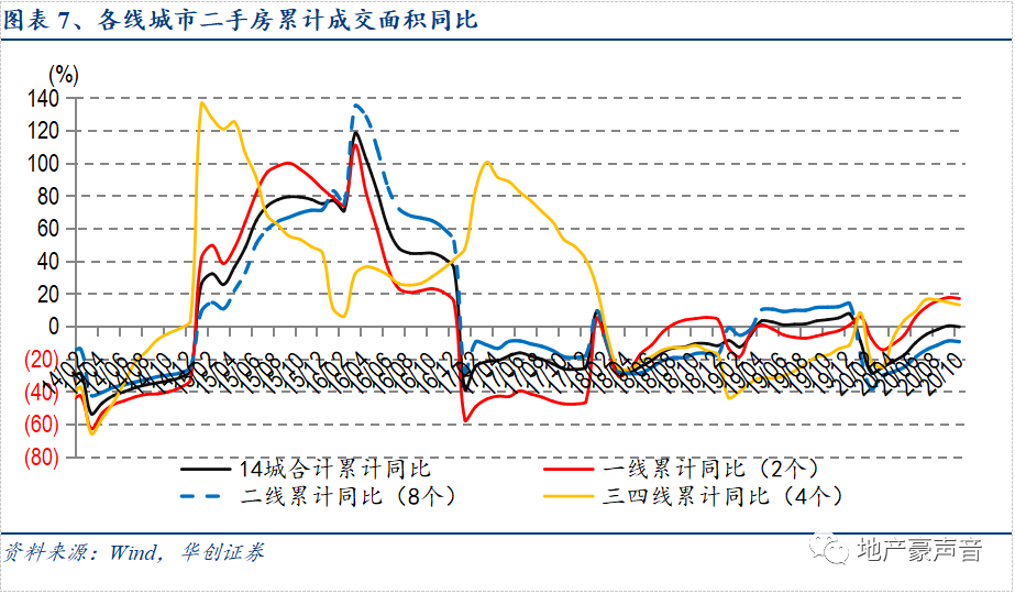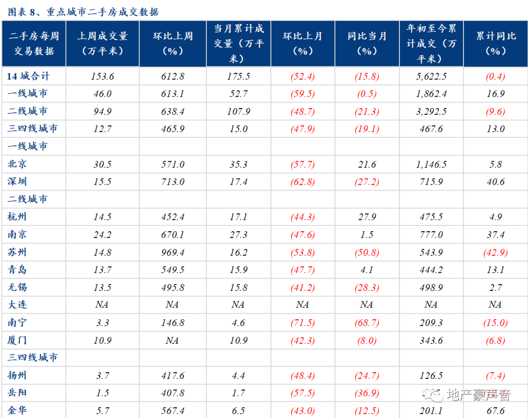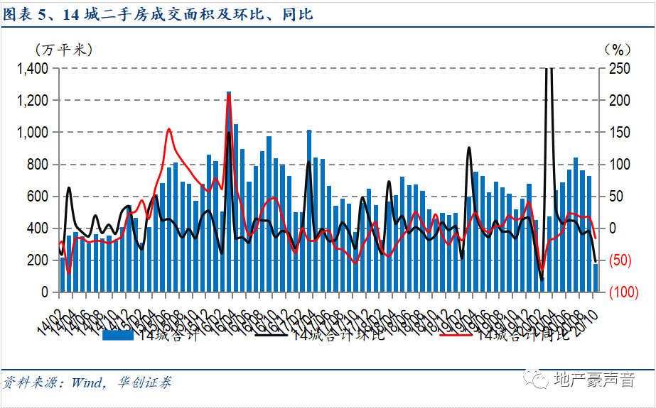 (二)二手房成交量:上周14城周成交环比+613%,10月月成交同比-16%、较上月-34pct