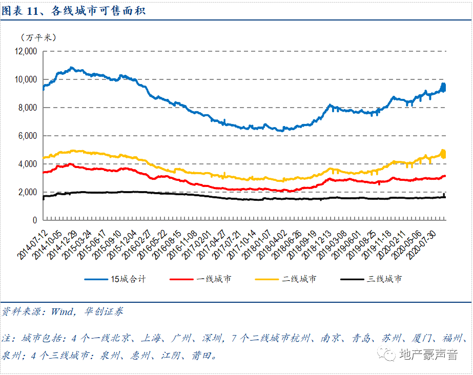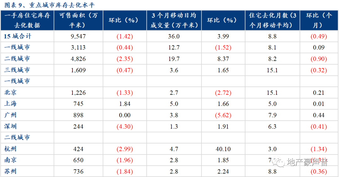 (三)新房库存:15城上周推盘196万方,可售面积环比-1%、去化月数环比下降0.5个月。
