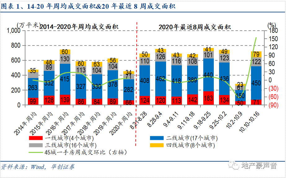 上周(10.10-10.16)45个重点城市新房合计成交721.5万平米,环比上升153.6%,较19年周均成交626万平米上升15.3%,较本年周均成交453.5万平米上升59.1%。