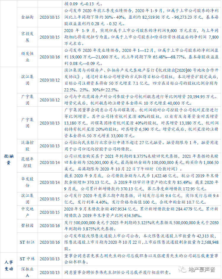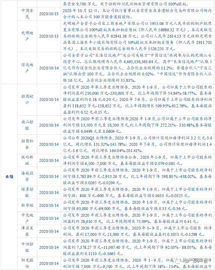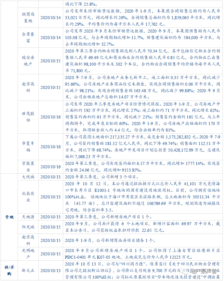 新大正与“四川同力德”、陈勇签订股权转让协议,将以支付现金9,700万元的方式收购四川民兴物业管理有限公司100%股权。南山控股发布2020年前三季度业绩预告,2020年1-9月,公司归属于上市公司股东的净利润亏损13,500万元至16,500万元,比上年同期下降272.21% - 310.48%。招商积余1-9月预计实现归母净利润3.2亿元-3.4亿元,同比增长131.32%-145.78%。金科股份下属公司金科服务经中国证监会核准,发行不超过19,166.67万股境外上市外资股。招商蛇口1-9月归属于上市公司股东的净利润盈利210,000万元–230,000万元,比上年同期下降54.84%-58.77%。华夏幸福7-9月签约销售额181.52亿元,同比下降49.74%;销售面积112.51万平方米,同比下降68.74%;境外间接全资子公司CFLD(CAYMAN) INVESTMENT LTD.完成境外发行0.6亿美元的高级无抵押定息债券,债券期限为5年,票面利率为8.05%。