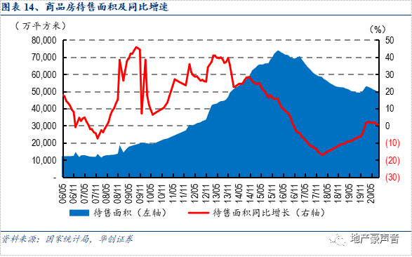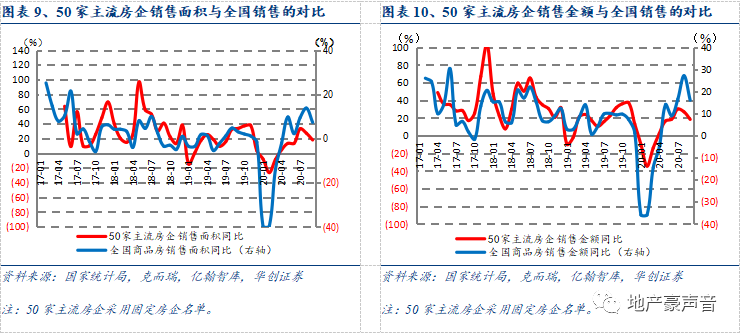 销售端数据小结:从1-9月累计来看,销售面积同比-1.8%,较上月+1.5pct,累计销售连续7个月修复;从9月单月来看,销售面积同比+7.3%,较8月-6.4pct,单月同比涨幅虽高位有所回落,但已实现连续5个月正增长,显示出市场整体需求韧性仍属较强。从结构来看,8月涨幅较大的东部和中部区域增速高位明显回落,西部区域销售实现连续5个月正增长并涨幅有所扩大,东北区域仍维持在较弱水平。此外,9月主流50家房企销售面积同比+17.8%,表现持续优于行业,表明行业集中度仍在提升。虽9月单月销售同比高位有所回落,但考虑到下半年推盘走高、市场去化率稳定略降、房企销售计划完成约束(9-12月主流18家房企销售额计划同比需完成+12%)、以及融资新规改善报表要求等因素,预计主流房企的销售向好或将延续到今年年底,我们维持2020年全年销售面积同比+0%的判断。