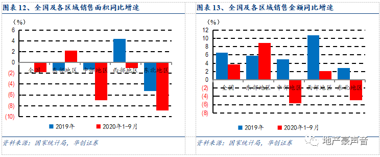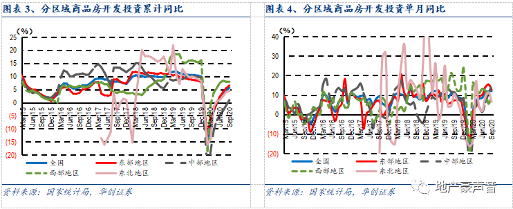 投资端数据小结:从1-9月累计来看,投资同比+5.6%、新开工同比-3.4%,主要投资数据继续修复。9月单月来看,投资同比+12.0%,较8月+0.2pct,连续3个月高位运行,并再创年内新高;开工同比-1.9%,较8月-4.4pct,同比继续下滑并转负;竣工同比-17.7%,较8月-7.8pct,短期仍然偏弱;9月中指300城土地成交面积同比-10%,较上月下降15pct;从短期而言(1个季度的时间尺度),融资新规影响下,后续拿地、开工以及竣工仍然处于偏弱趋势,从中期而言(1-2年的时间尺度),目前行业的低库存下的补库存需求下,我们对于后续的开工和竣工依然保持相对积极的观点,但明后年具体具体预测还需要根据融资新规实施情况而重新评估。从结构来看,东部和中部区域投资增速继续高位运行,西部区域投资增速在短暂回落后再次快速向上,东北区域投资增速有所回落。新冠疫情之下,我们认为房地产仍将是我国经济的压舱石,稳经济需要稳房地产。