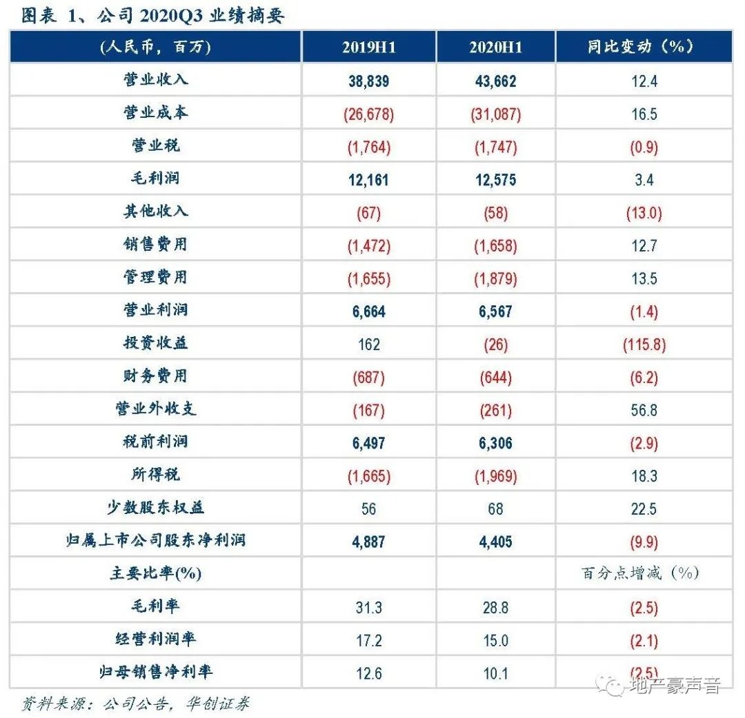 3Q2020,公司实现营业收入436.6亿元,同比+12.4%;实现归母净利润44.0亿元,同比-9.9%;实现基本每股收益1.01元,同比-9.8%。毛利率和归母净利率分别为28.8%和10.1%,分别同比-2.5pct和-2.5pct;三费费率为9.6%,同比-0.2pct。截至2020H1末,公司预收账款799亿元,同比-9.5%,可覆盖19年地产营收1.3倍。