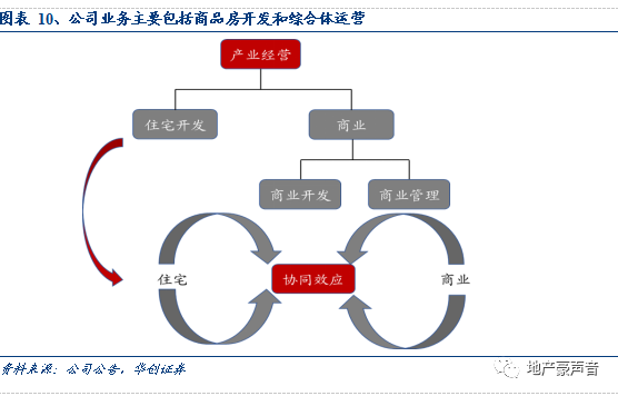 公司主营业务可分为住宅地产开发、商业地产开发和商业地产运营,其中住宅开发包括中高层住宅、低密度住宅、多层住宅与别墅等多产品类型开发销售;商业开发主要包括综合体配套的住宅开发、酒店式公寓及沿街商铺等开发销售;商业地产运营主要包括有型物业自持运营或对外租赁,主要为购物中心。