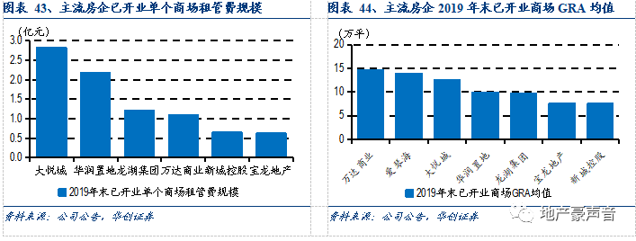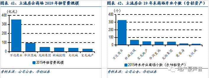 在商业地产行业竞争格局方面,公司布局重心倾斜于三四线城市,目前主要的竞争对手包括万达、宝龙等,其中万达规模最大,截至2019年末,万达已开业商场323个(其中自持241个、轻资产30个、合作52个),可出租面积3,210万平,2019年租管费351亿元;宝龙规模略小,2019年末已开业45个,可出租面积342万平,2019年租管费28亿元。