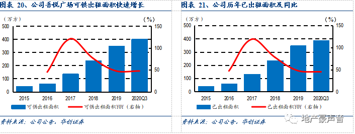 吾悦广场高速拓张推动公司可供出租面积和已出租面积快速增长。2016-2019年可供出租面积CAGR达69.8%,已出租面积CAGR达70.5%,已出租面积复合增速高于可供出租面积意味着综合体出租率提升。截至2020Q3末,公司可供出租面积为401.5万方,同比+47.4%;已出租面积387.8,同比+44.9%。