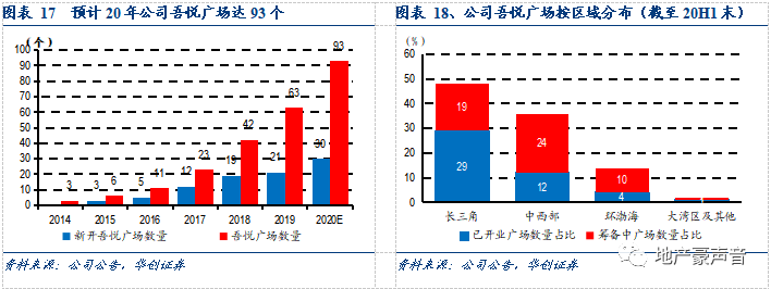 截至2020H1末,公司已开业吾悦广场已达63座,2020年公司计划新开吾悦广场30座,累计开业预计将达93个,对应已开业面积591万方。截至2020H1末,公司在手吾悦广场达139座,其中长三角、中西部、环渤海区域分别占比48%,36%、14%,长三角区域仍属公司布局重心,但中西部区域占比快速提升。
