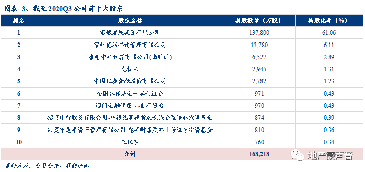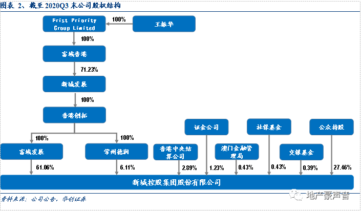 公司现实际控制人仍为王振华,其持有新城发展(股票代码:1030.HK)71.23%的股权,并且通过新城发展港股平台公司持有新城控股(股票代码:601155.SH)67.17%的股权,王振华合计间接持有新城控股47.85%的股权,公司股权结构较为稳定。此外,中国证金持有公司2,781.6万股,占比总股本1.23%;2020Q3社保基金和澳门金融管理局分别增持970.8万股、970.0万股,分别占比总股本0.43%、0.43%;社保基金和澳门金融管理局持股显示了对公司价值的认可。