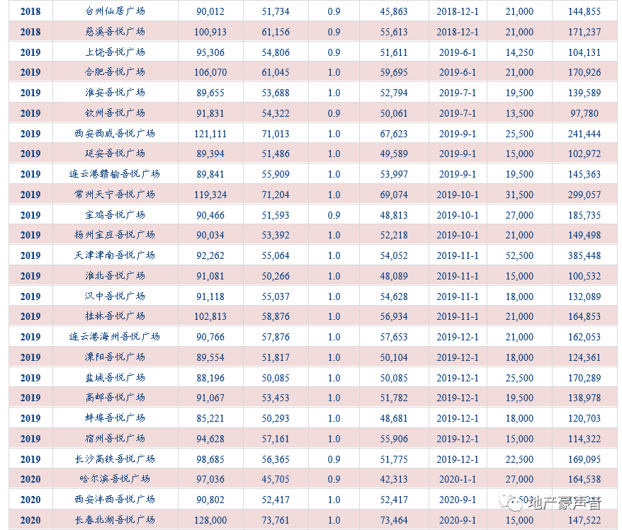 2016-2020E年,公司分别新开业吾悦广场5、12、19、21、30座,新开业广场呈加速上升势态。并且在2020年融资有所缓解后,公司再度加大综合体获取力度,2020年1-9月分别在德阳、随州、昆明、滁州、天津等超25个城市新获取近30个综合体项目。可以看到,即便在最为困难的2019年,公司也没有在商业地产业务上降速,并且一旦公司融资环境好转,马上加大商业综合体的拿地力度,彰显出公司发展商业地产业务的战略坚定。