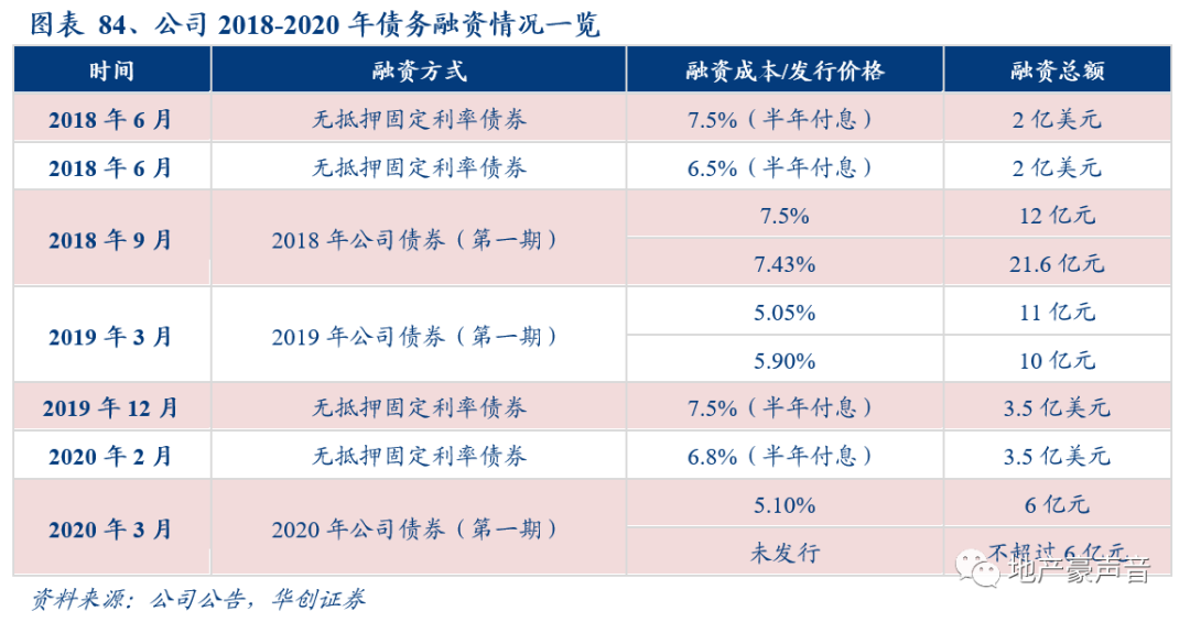公司在2019Q3以来暂停融资后,2019Q4惠誉、标普、中诚信和联合资信先后恢复公司评级展望稳定,并将公司及其相关债项移出信用评级观察名单。2019年年末公司基本恢复市场融资,2019年12月发行无抵押固定利率美元债3.5亿美元,利率7.5%;2020年2月公司再发行无抵押固定利率美元债3.5亿美元,利率6.5%,融资成本有所下行;2020年3月,公司发行6亿元公司债,利率5.10%,较去年同期的5.05%基本持平。