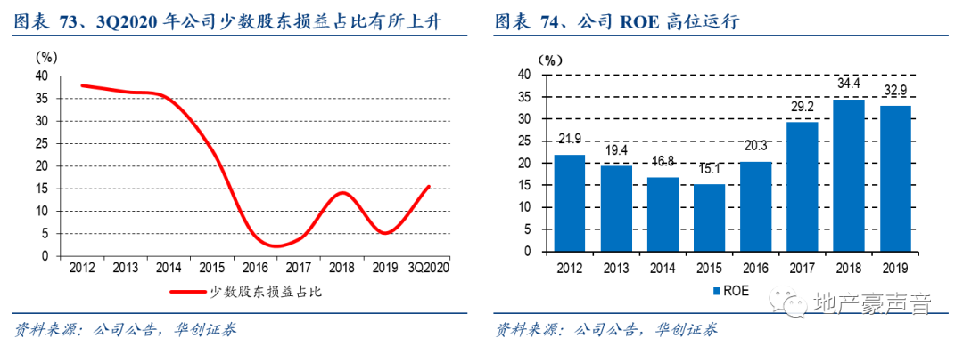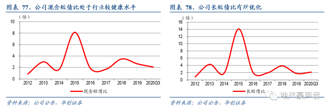 1)杠杆情况:公司2019年年末净负债率16.4%,在主流31家房企中排名最低,虽2020Q3净负债率有所提升,但仍属于行业最低水平之一;债务结构方面,公司2019年年末现金短债比、长短债比分别为2.6、1.8倍,在行业中处于非常健康水平;