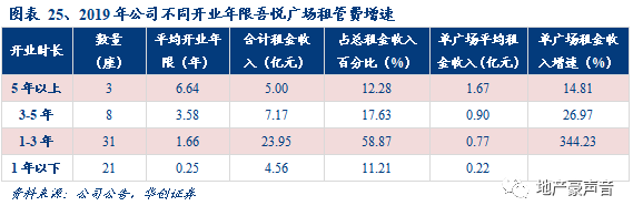 2019年,公司开业5年以上3座吾悦广场合计租管费收入5亿元,平均单座租管费收入1.67亿元,同比增幅15%;开业3-5年的项目8座,平均单座租管费收入0.9亿元,同比+27%;开业时间1-3年的广场31座,平均单座租管费收入0.77亿元,平均增幅达344%。