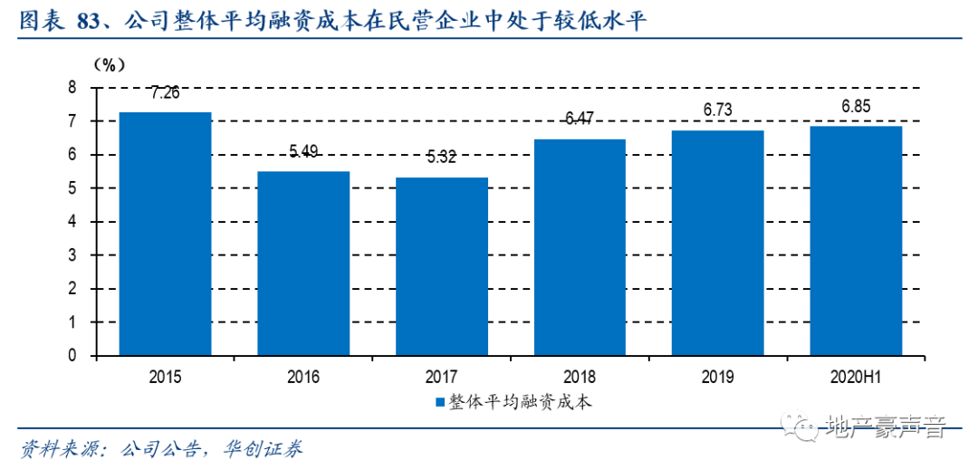 公司融资成本在民营企业中处于较低水平。2019年,公司有息负债总额达740.8亿元,同比+5.1%。2020H1公司整体融资成本约为6.85%,较上年上升0.12pct,受2019年下半年负面新闻影响,融资成本仅略有提升。有息债务结构方面,30%为公司债,45%为银行贷款,18%为债务融资工具。其中短期贷款占比41%,长期借款占比59%。