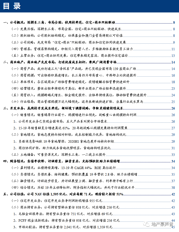公司2019年杠杆水平显著下降。至20Q3末,净负债率43%、长短债比2.2倍、现金短债比2.1倍,优于行业平均水平;19年经常性收入/利息支出已提升至72%,并预计21-22年将突破100%。惠誉、标普、中诚信、联合资信、穆迪等先后恢复公司评级展望至稳定,近期标普进一步上调评级展望至正面。公司最困难阶段料已经过去,20H1融资成本为6.85%,预计后续也将有改善。在融资新规下,公司低杠杆也赋予较强的逆势扩张弹性。估值方面,随着后续公募Reits的逐步推进和商管企业的陆续上市,公司商业地产的价值也有望得到进一步显性化提升。根据分部估值法,我们测算公司NAV为:住宅开发重估增值955亿元+商业持有重估增值256亿元+归母净资产384亿元=1,595亿元,对应每股NAV为70.7元/股,现价较之折价51%。