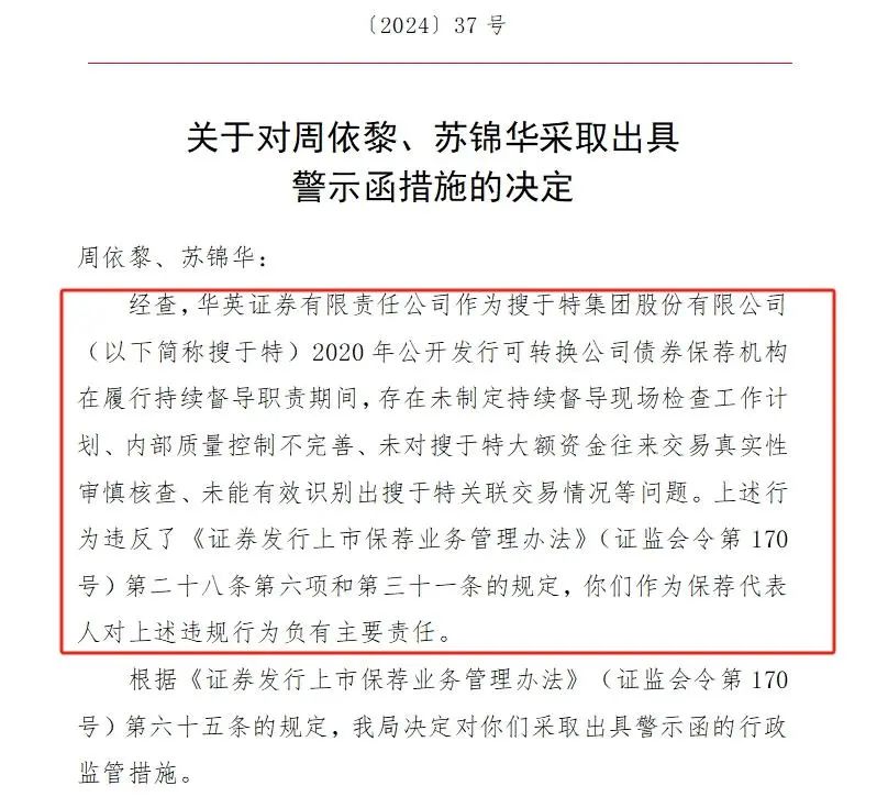 据广东证监局行政监管措施决定显示,华英证券作为搜于特2020年公开发行可转换公司债券保荐机构在履行持续督导职责期间,存在未制定持续督导现场检查工作计划、内部质量控制不完善、未对搜于特大额资金往来交易真实性审慎核查、未能有效识别出搜于特关联交易情况等问题。