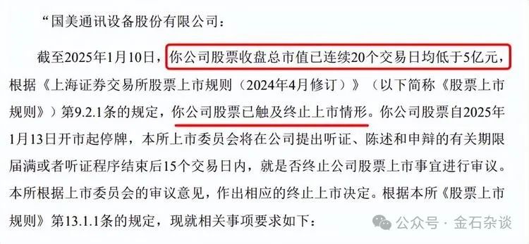 股价一地鸡毛之下,公司市值持续萎缩,直接触发了退市新规要求的市值要求:即20个交易日不得低于5亿。*ST美讯(维权)1月13日停牌,上交所上市委员会将在15个交易日之内就是否终止上市进行审议,上交所根据审议结果做出最终决定。目前,国美通讯依旧有1.37万股民,天天跌停在劫难逃。