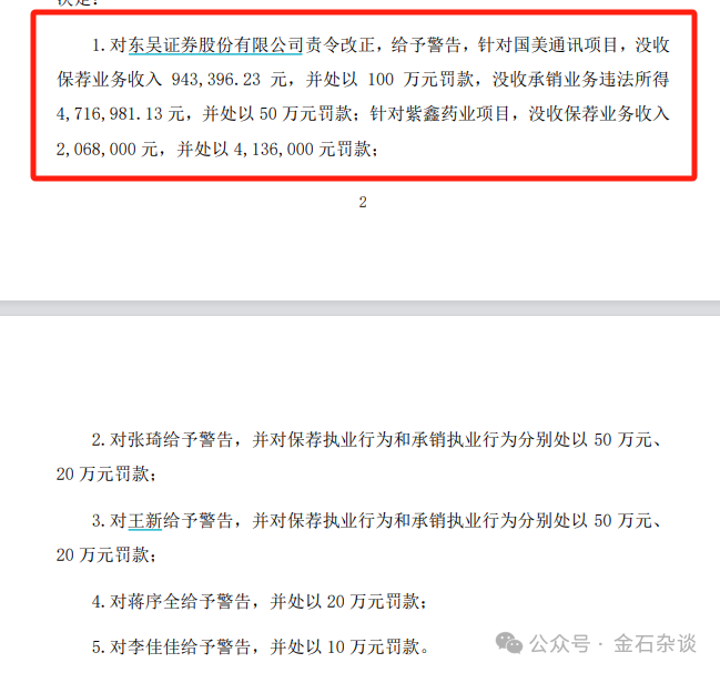 3)最终,东吴证券被罚没1336万元,在国美上被没收保荐承销费566万,并罚款150万;在紫鑫药业上则是"没一罚二",没收保荐业务收入207万元,并处以414万元罚款,这说明财务造假的问题处罚力度会更大。此外,监管还对相关签字保代除以罚款,国美则是保代罚款更多,而紫鑫药业保代罚款只有10万、20万。