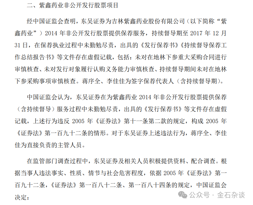 1)关于紫鑫药业,涉及财务造假、倒查时间长达10年。东吴证券在紫鑫药业2014年非公开发行中担任保荐人和主承销商,持续督导期一直到2017年12月。根据处罚书,东吴证券出具的《发行保荐书》《持续督导保荐工作总结报告书》等文件存在虚假记载,包括:未对在地林下参重大采购合同进行审慎核查、未对发行对象履行认购义务能力审慎核查、持续督导期间未对在地林下参采购事项审慎核查。
