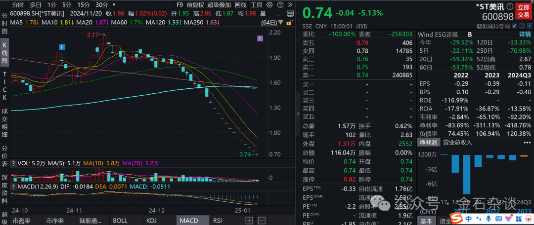 其实,在达成退市新规的触发退市情形的同时,该公还有望达成财务退市情形。从财务上来看,2023年营收低于1亿且亏损,2024年前三季度的营收萎缩74%,只剩下800多万,且亏损3000万,等到2024年财报出炉,即便没有因实质退市,国美通讯依旧是要退市的。