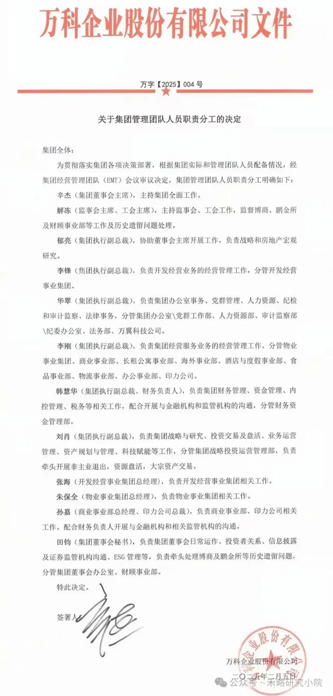 万科于2025年2月5日深夜在公司内部发布了《关于集团管理团队人员职责分工的决定》,明确了一批高管最新工作安排,涉及12人。深圳地铁集团董事长辛杰接棒郁亮,出任集团董事会主席。