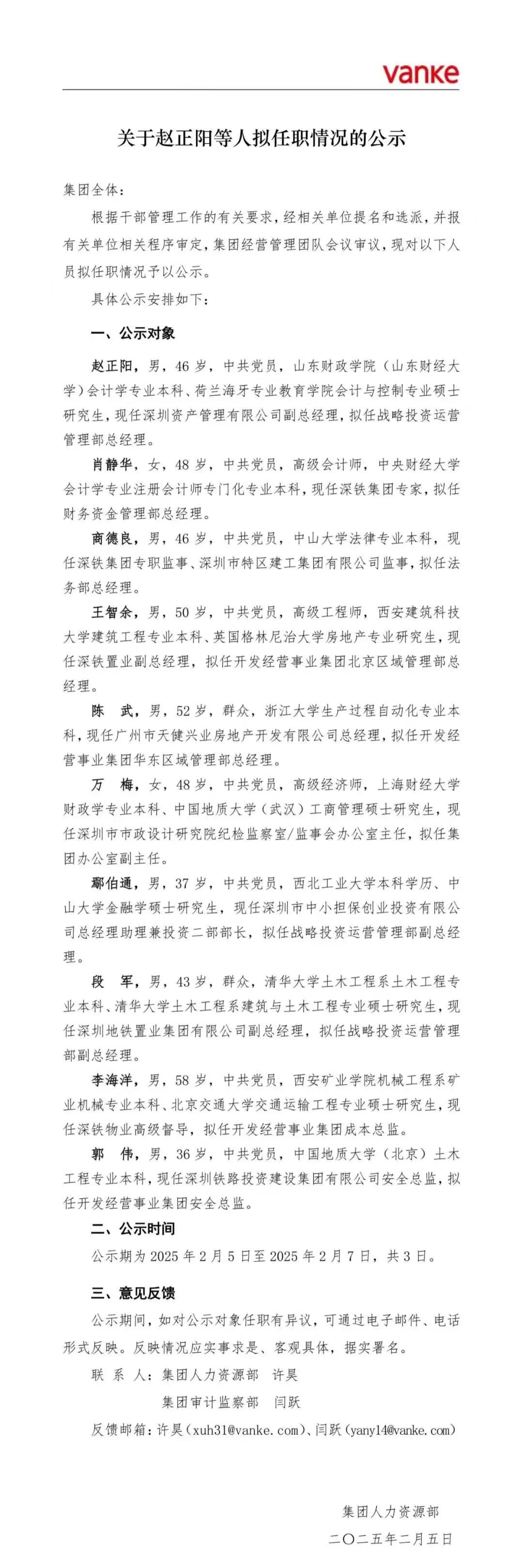 而在2月5日更早时间,万科发布拟任职公示,这些人员均来自深圳国资系统。拟出任集团战投、财务部、法务部、北京区域、华东区域区等多个关键岗位。