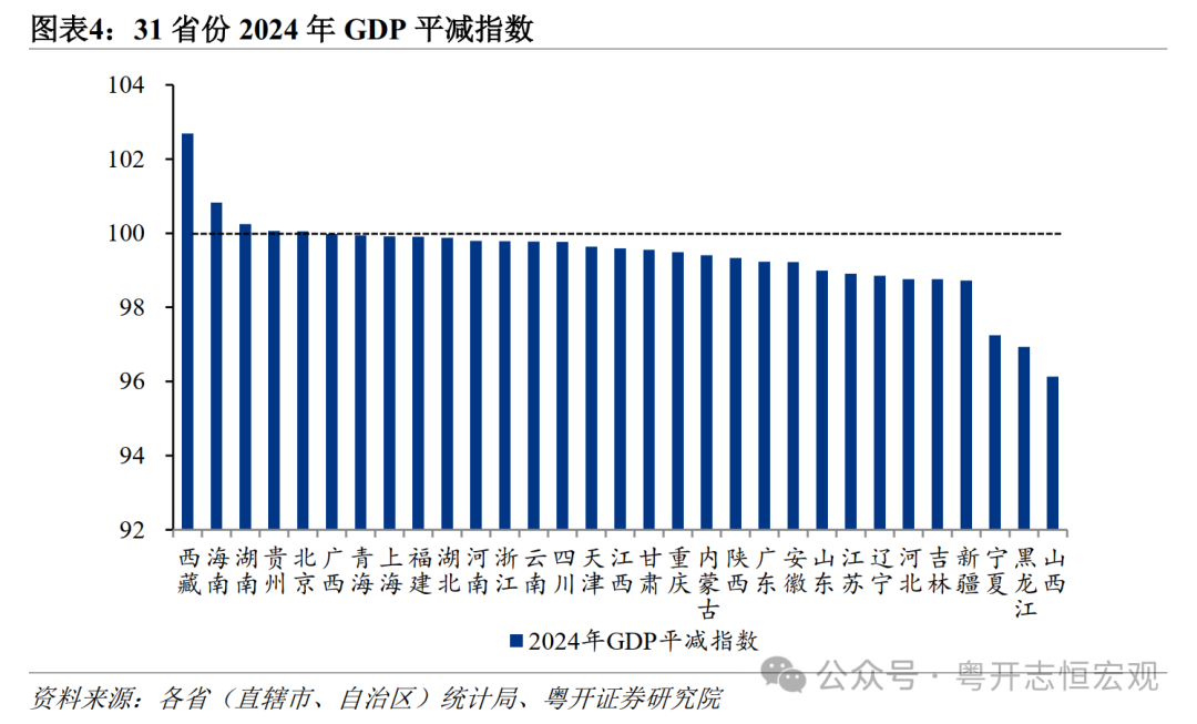 从名义增速看,26个省份“名不副实”,山西名义GDP负增长。2024年,一揽子增量政策释放国内需求,2024年,5个省份名义GDP增速超过实际增速,分别是北京、贵州、湖南、海南和西藏,平减指数高于100,即意味着物价总水平上升。但全国物价低迷的形势仍待进一步扭转,全年PPI同比下降2.2%,降幅略有收窄;CPI同比增长0.2%,持平于上年。受到物价低迷拖累,2024年,全国有26个省份名义GDP增速低于实际增速,省份数量较2023年增加4个,平减指数低于100,即意味着物价总水平下降。其中,山西、黑龙江、宁夏经济增长受物价拖累较为严重,2024年名义增速分别低于实际增速3.9个、3.2个、2.9个百分点。在国际油价下行、煤炭石化等工业品价格调整等因素影响下,宁夏、山西2024年PPI同比大降超6%;受到居民消费信心不足、房地产相关耐用品价格下跌及部分服务消费增量不增价影响,宁夏、福建2024年CPI同比负增长,广东、四川、上海、海南、吉林、西藏六省全年CPI零增长。