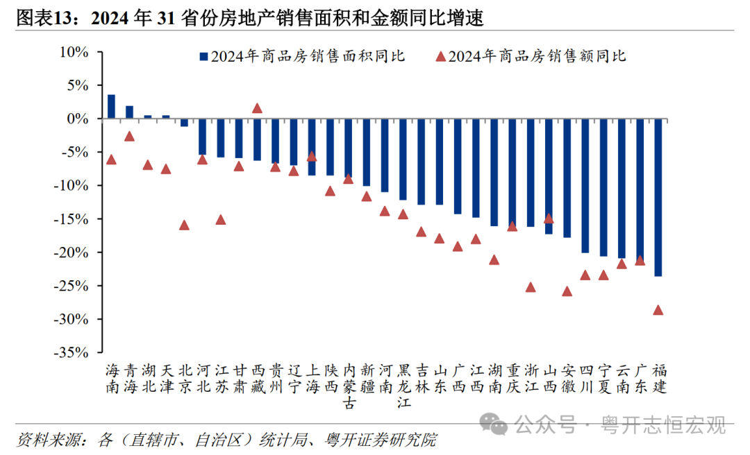 从投资看,多数省份制造业投资和基建投资景气,房地产投资处于探底期。2024年,全国固定资产投资保持平稳增长,分领域看,制造投资保持高景气度,房地产投资依然低迷,基建投资结构分化,中央财政主导的水利投资高增长、地方主导的交通投资承压。从2024年目标完成情况看,受益于“两重”政府投资发力、民间投资信心回暖,西藏、宁夏、河南、河北、江西等固投增速高于全国,且完成了预期目标。分区域看,东北、东部、中部和西部地区投资分别增长4.2%、1.3%、5.0%和2.4%。中部地区高技术制造业、装备制造业投资快速增长,河南、湖北、安徽、湖南制造业投资分别增长24.7%、15.4%、13.3%、9.5%;四省民间投资分别增长10.5%、3.0%、1.7%、4.0%,表现均好于上年。分省份看,全国有28个省份固定资产投资正增长,20个省份投资增速跑赢全国水平,西藏、内蒙古固投增速连续两年占据全国前两位,受基建投资增长带动明显,内蒙古基建投资占全部投资的比重超40%。华南、西南地区一些省份投资增速缓慢,云南、广东、广西三省份投资负增长,分别下降7.7%、4.5%、3.2%;重庆、贵州投资仅增长0.1%、0.4%。一是由于房地产投资下滑,广东房地产开发投资下降18.2%,拖累投资增长超5个百分点。二是高风险省份地方财政优先化解债务风险,地方财政主导的投资被动压缩。2024年,甘肃固定资产投资按项目单位隶属关系划分,中央投资上升47.2%,而地方投资下降2.2%;云南基建投资下降4.0%,其中交通投资下降13.0%。