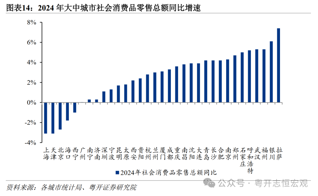 从消费看,居民消费需求仍有待提振,高能级城市消费表现不及低能级城市。2024年是商务部确定的“消费促进年”,各地利用财政资金支持消费品以旧换新。分类别看,限额以上单位零售额中,家电、家具、办公用品、通讯器材类商品消费高增长,而受汽车价格战影响汽车类消费同比仅增0.8%。与2024年地方政府工作预期目标相比,大多数省份未能实现社零增长目标,消费对经济增长的贡献仍有待提升。2024年,全国最终消费支出对GDP增长贡献率44.5%,低于2022年的49.3%,处于近二十年的较低水平。居民收入增长预期走弱是制约消费重要原因,2024年,全国29个省份城乡人均可支配收入同比增速较2023年有不同程度放缓,上海人均可支配收入增长4.2%,低于2023年2.4个百分点。分区域看,中部地区消费增长相对较快。东北、东部、中部和西部地区社会消费品零售总额分别增长3.3%、2.6%、5.1%和3.7%。分省份看,26个省份社零同比正增长。西藏、河南、河北、湖南、湖北社零分别同比增长7.2%、6.1%、5.5%、5.4%、5.1%,增速分列全国前五位;海南社零同比-4.2%,增速最低。分城市看,低能级城市消费表现好于高能级城市。一线城市中,上海、北京社零负增长,广州基本持平,深圳增长1.1%,与汽车消费、餐饮服务消费增长乏力有关;与之形成鲜明对比的是,福州、武汉、石家庄等二线城市社零增长都在5.0%以上,南京、合肥、长沙社零增长超4.0%。