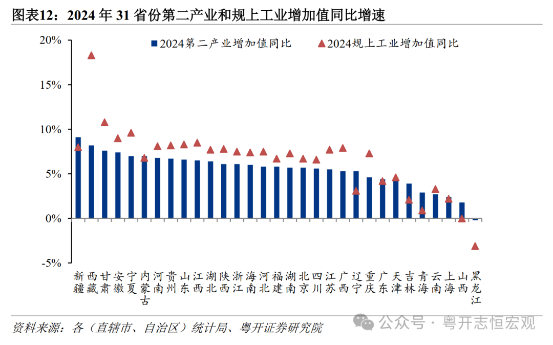 从工业看,工业在名义GDP的比重下降,但对GDP实际增长的拉动率上升。我国工业经济量涨价跌,PPI连续两年负增长,工业占名义GDP的比重下降。2024年,全国三大产业增加值占比分别为6.8%、36.5%、56.7%,第二产业占比较2023年修订数下降0.3个百分点。但工业仍是国民经济的主体和增长引擎,工业经济发展发挥“压舱石”作用。扣除价格因素,工业生产对经济增长的贡献继续提升。2024年,工业拉动GDP实际增长1.7个百分点,较2023年上升0.5个百分点。除了山西、黑龙江外,全国29个省份规上工业增加值实现正增长。一是西部省份加快资源优势向产业优势转化。西藏积极建设绿色工厂,推进水泥、石材产业优化布局,2024年规上工业增加值同比增长18.3%,位居全国第一;甘肃积极推进新型工业化,省属企业加快发展新能源、新材料产业,规模以上工业增加值增长10.8%,位居全国第二。二是中部省份加快承接产业转移壮大制造业集群。河南引入和培育比亚迪、中州时代等产业链主导项目,吸引相关上下游企业集聚,电子、汽车、装备制造等行业成为增长引擎;安徽2024年新能源汽车产量同比增长93.4%,汽车总产量位居全国第二,汽车制造业增加值增长26.7%,是工业增长的最大贡献来源。江西借助“两新”政策,推动装备制造业和电子制造业快速增长,2024年江西智能手机产量位居全国第三,同比增长44.2%。三是东部省份加快壮大新兴产业和数字经济。江苏、浙江规上工业增加值分别增长7.7%、7.5%,行业大类增长面分别达85%、82%。江苏制造业高质量发展指数连续4年全国第一,高新技术产业产值占规上工业比重首次超过50%,工业战略性新兴产业产值占规上工业比重达41.8%。浙江提升数字经济优势,数字经济核心产业增加值增长7.6%,规上工业企业数字化改造实现全覆盖。