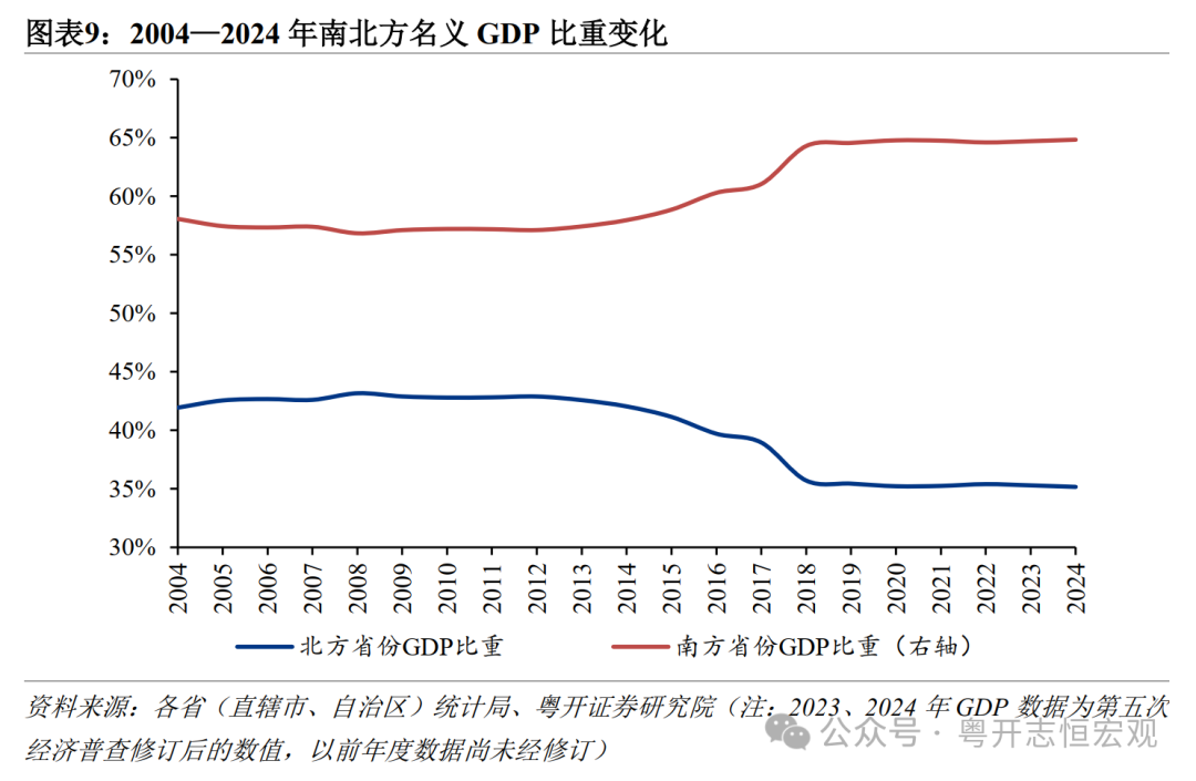 4、区域格局:近五年南北省份GDP占比保持相对稳定,“南升北降”主要发生在2013-2019年,其后南北占比大体稳定,2024年南方经济占比略上升0.1个百分点至64.8%。中国南北经济格局,很大程度上受到新兴产业与传统产业竞争力影响,背后是市场化程度和营商环境的差异。南方有新质生产力支持但同时面临房地产冲击,北方有资源和“一带一路”出口优势但遭遇物价冲击。受经济结构转型、供给侧改革去产能和挤水分的影响,北方省份GDP比重从2012年的42.9%降至2019年的35.4%。2020年以来,双循环新发展格局加快构建,南北GDP比重变化相对较小。在百年变局下,北方能源资源型省份经济高增长,但2024年受到工业品价格回落影响较大,部分采掘业、上游制造业量增价减;南方部分省份加快培育新质生产力,战略性新兴产业快速发展,形成区域经济新增长点;南方省份GDP占比由2023年的64.7%升至2024年64.8%,北方省份GDP占比由2023年的35.3%降至35.2%。