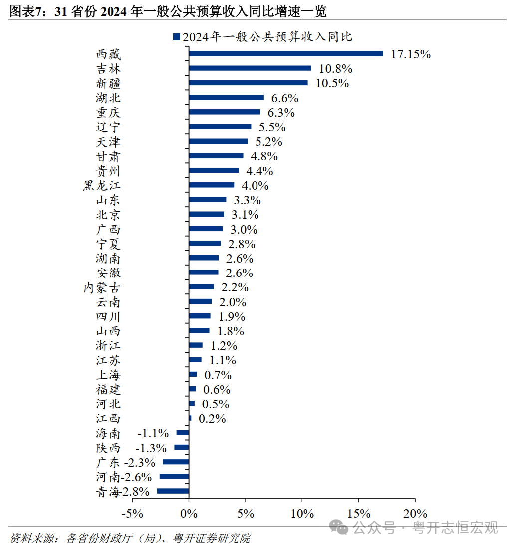 分省份看,2024年地方财政收入增速有所放缓,西部地区财政收入增速快于中东部地区。受房地产调整转型、物价低迷、税收优惠政策等因素影响,2024年全国和地方财政收入增速均大幅低于2023年。分区域看,2024年,东北、东部、中部、西部地区财政收入分别增长6.2%、0.8%、1.8%、3.2%,西部地区财政收入增速快于中部和东部地区,东北地区财政收入增速较快主要源于非税收入高增。西部省份一般公共预算收入整体快于东部和中部。这种格局的变化主要源于百年未有之大变局背景下,能源安全的重要性抬升,“一带一路”的重要性上升,西部资源密集型省份经济和财政收入增长相对较快;而东部和中部省份遭遇外需波动加剧、房地产低迷等多重压力,经济结构和产业结构持续调整,财政收入增速相对偏慢。分省份看,26个省份2024年一般公共预算收入正增长,广东、河南、陕西等五省份一般公共预算收入下降。2024年税收收入增长压力较大,20个省份地方税收收入同比负增长。由于2023年制造业企业缓税入库抬高基数,多个省份2024年增值税收入同比负增长;受到汽车市场“内卷式竞争”冲击工业企业利润、房地产市场持续低迷等影响,广东、吉林等地企业所得税收入负增长;受房地产市场拖累,多个省份契税、土地增值税收入下滑明显。