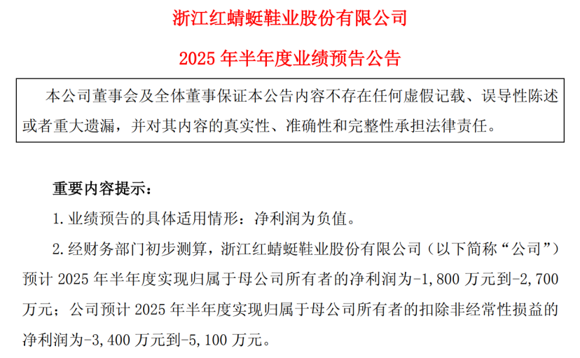 7月14日晚,红蜻蜓(603116.SH)发布半年度业绩预减公告,预计2025H1实现扣非归母净利润为亏损3,400~5,100万元,与上年同期相比,预计减少5,100~6800万元。红蜻蜓称业绩下滑的主要原因为:传统时尚鞋服类消费需求依然疲软,存量竞争日趋激烈,公司营业收入较上年同期有所下滑,营业收入的下滑导致公司净利润由盈转亏。