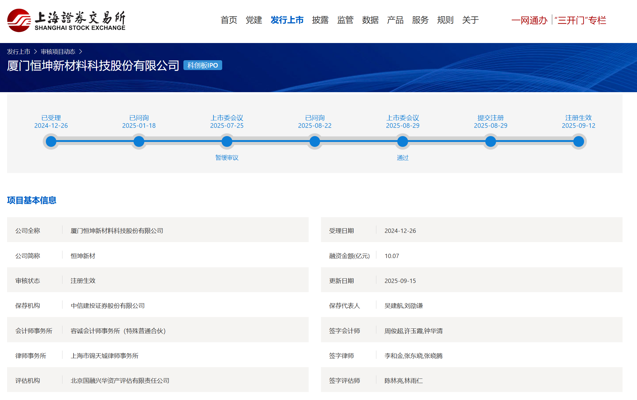 2025年8月29日,上交所上市审核委员会2025年第32次审议会议结果公告显示,厦门恒坤新材料科技股份有限公司(以下简称“恒坤新材”)首发申请获上市委会议通过,公司拟在科创板上市。9月12日,证监会发布关于同意恒坤新材首次公开发行股票注册的批复。